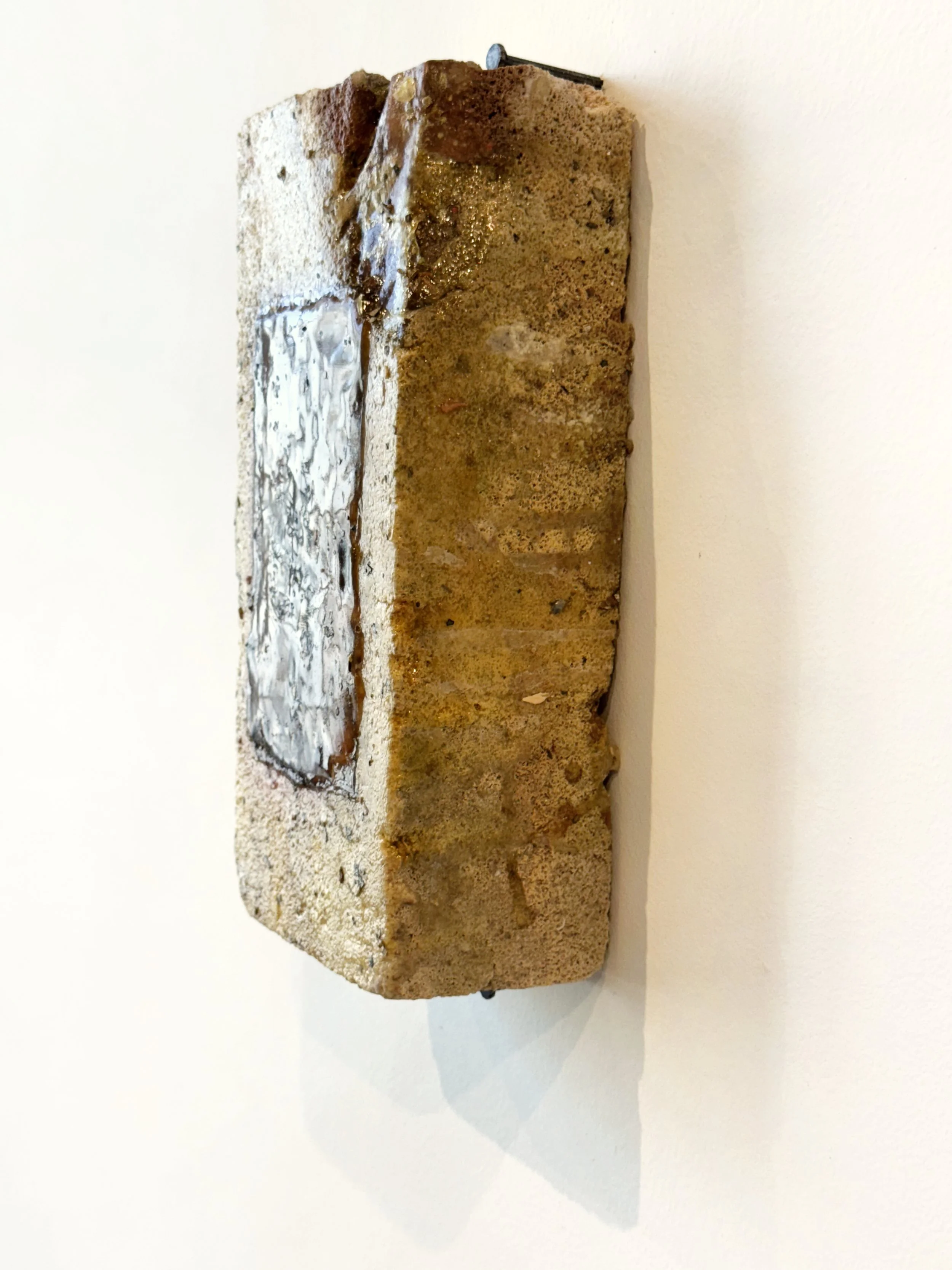 Cesar Herrejon. mickey brick . 2025. Polyurethane, caulk, latex, tea on found brick 9 x 5 x 2.5 inches.