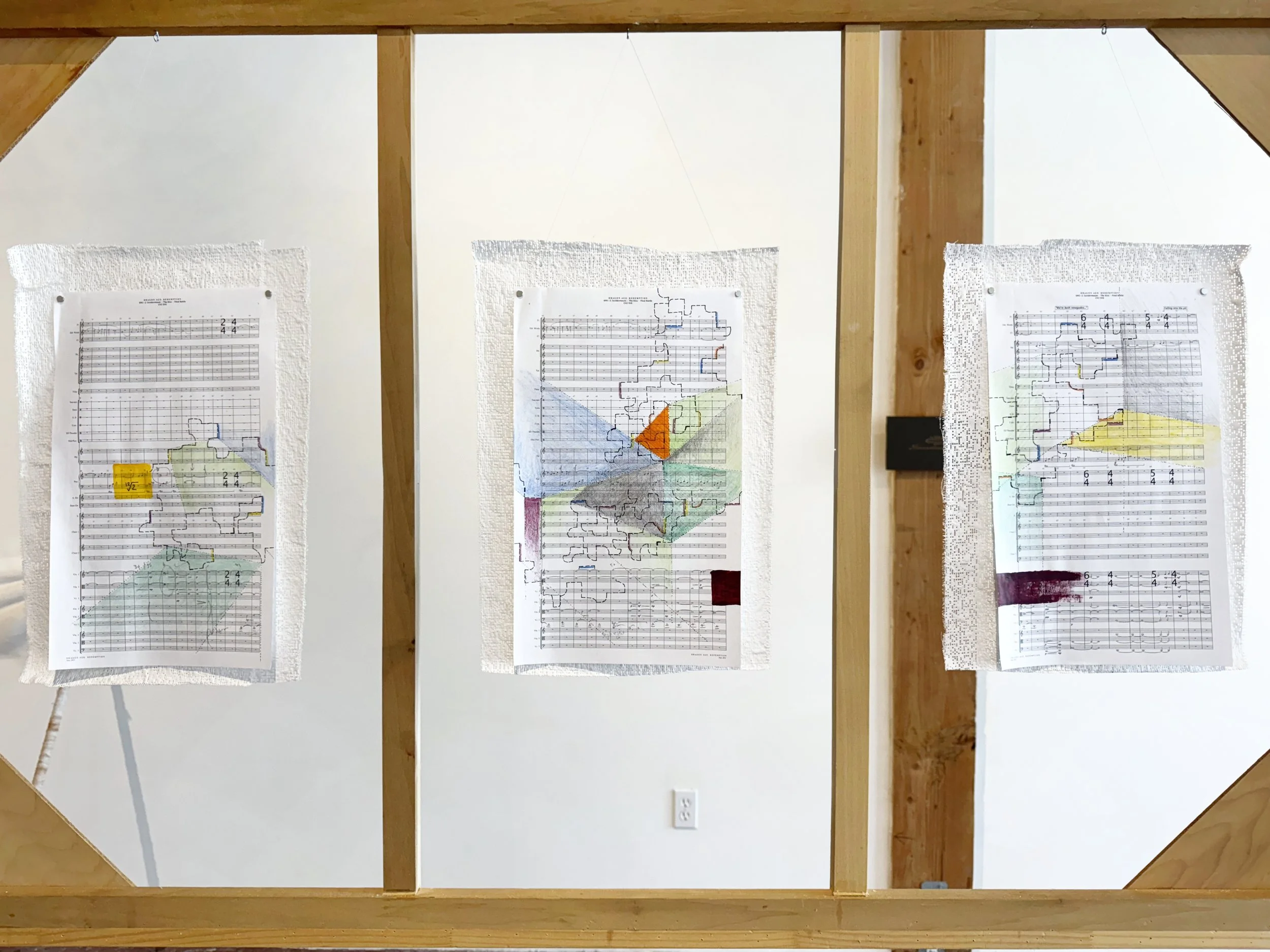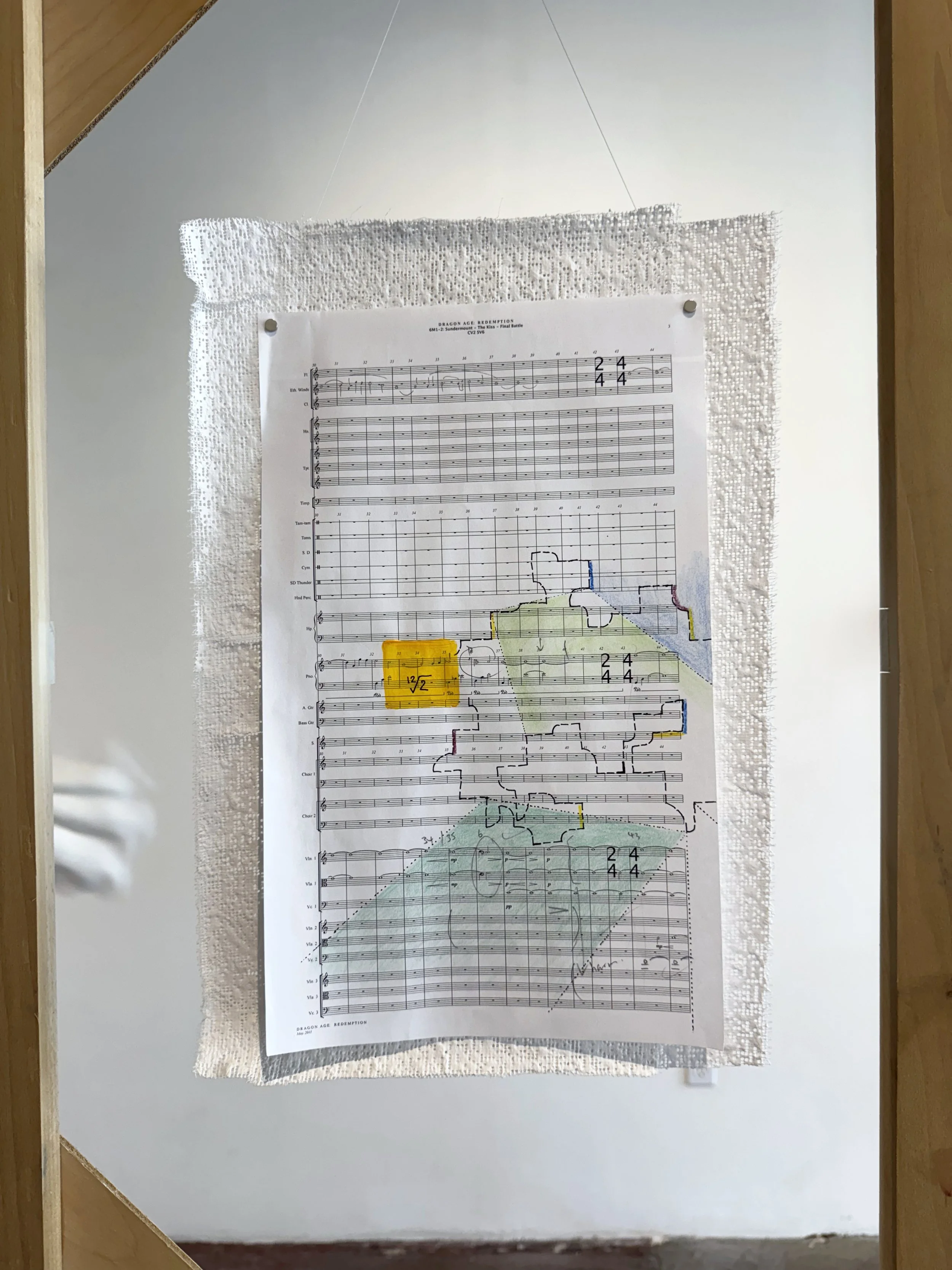 Saun Santipreecha. Excavation Site—Scale Pathologies [or, Dragon Age: Redemption] . 2025. Acrylic, colored pencil on Dragon Age: Redemption score paper; bass sound exciter (x2), stereo preamp (x1), audio player (x1), recording from Dragon Age: Redemption 14 x 8.5 inches each (score paper). [Audio installed in gallery, audible throughout the entire exhibition.]