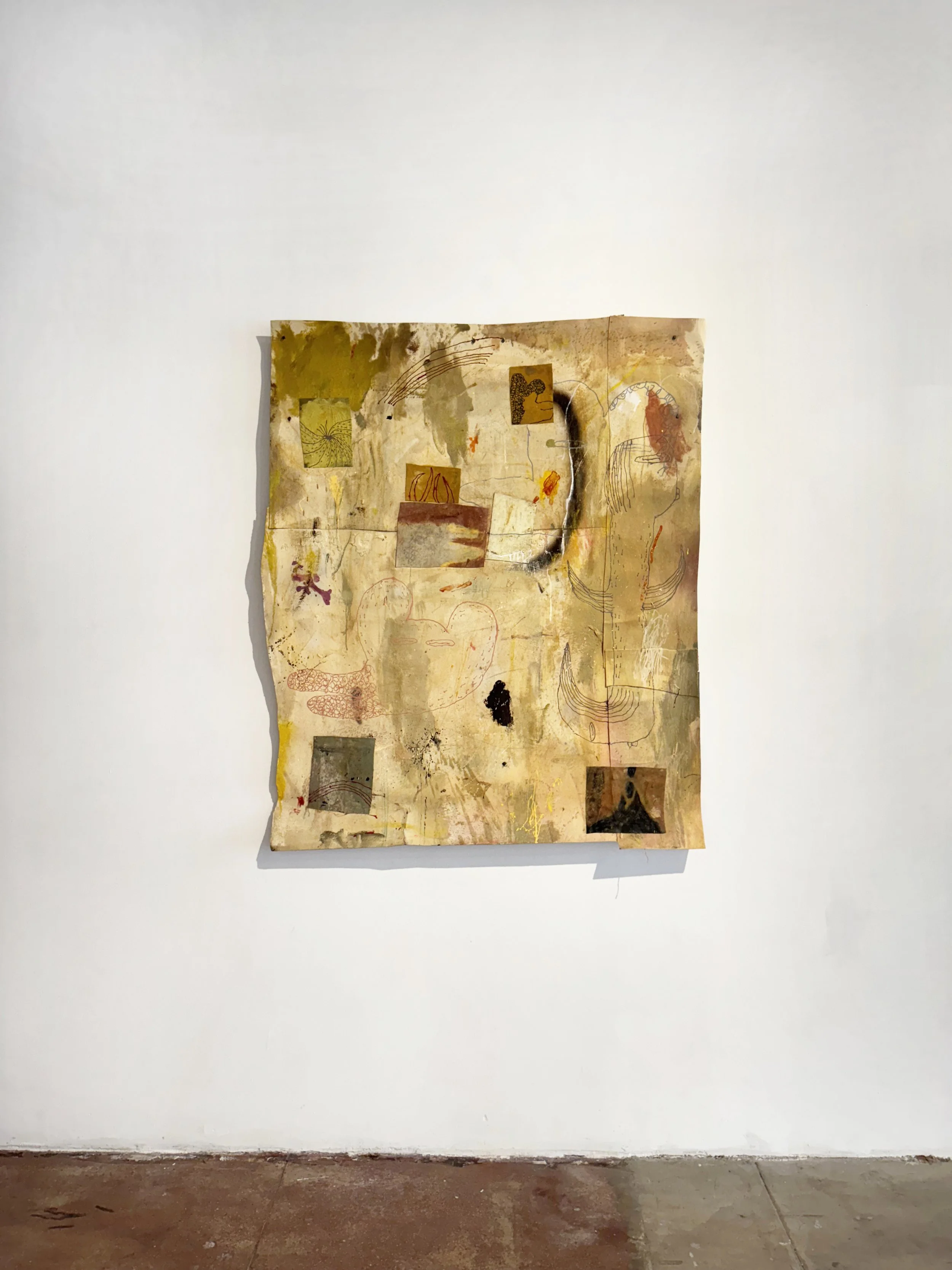 Cesar Herrejon. guiso . 2025. Oil, acrylic, watercolor, fabric on tar paper. 54 x 45 inches.