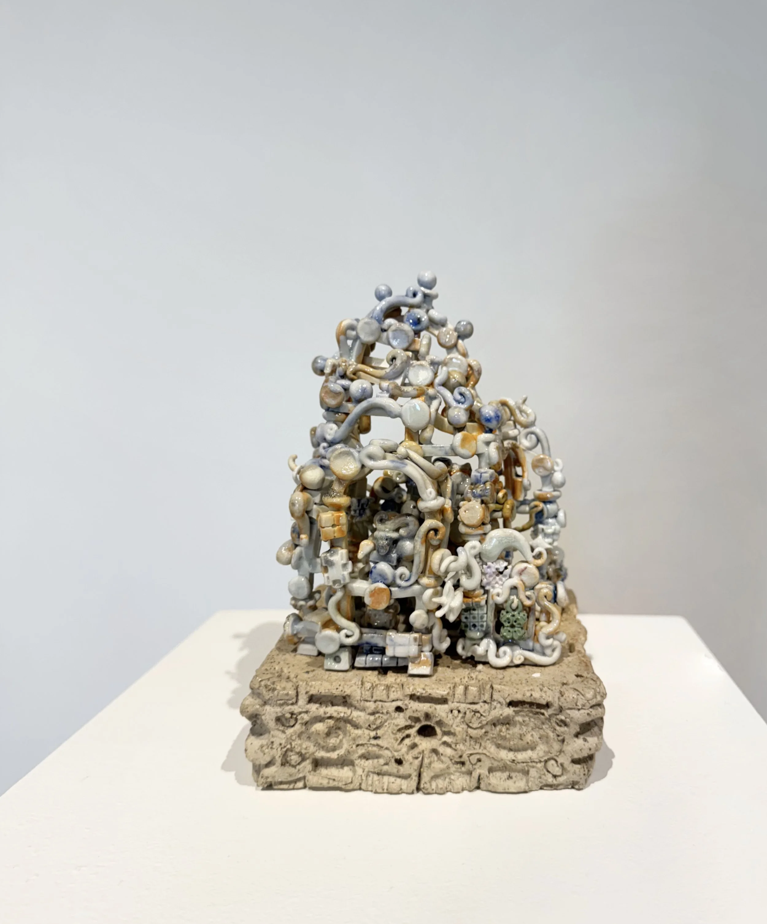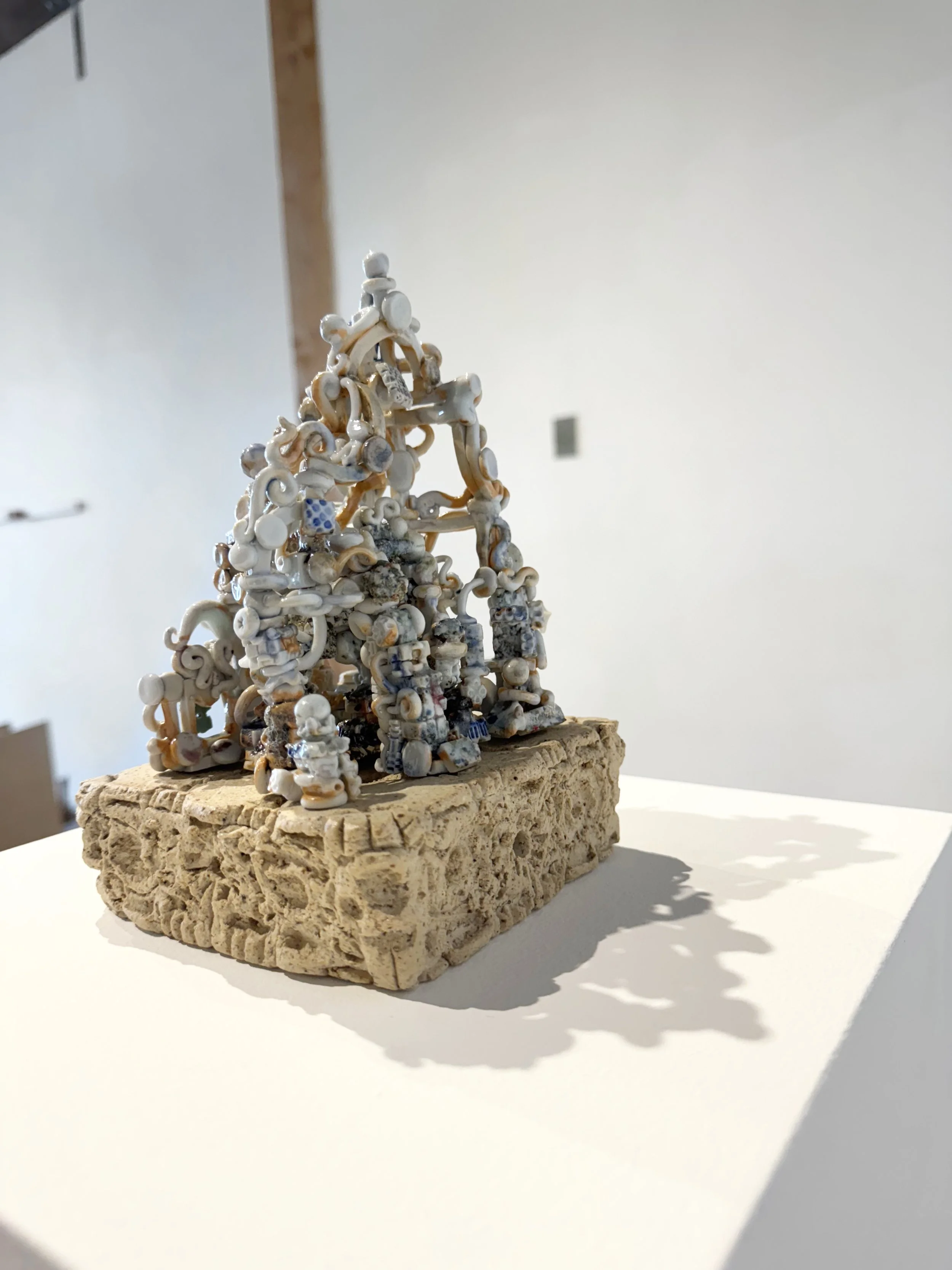 Trey Ross. 022 . 2025. Porcelain, glaze, stoneware pedestal. Cone 10. 8 x 5.5 x 5.5 inches.