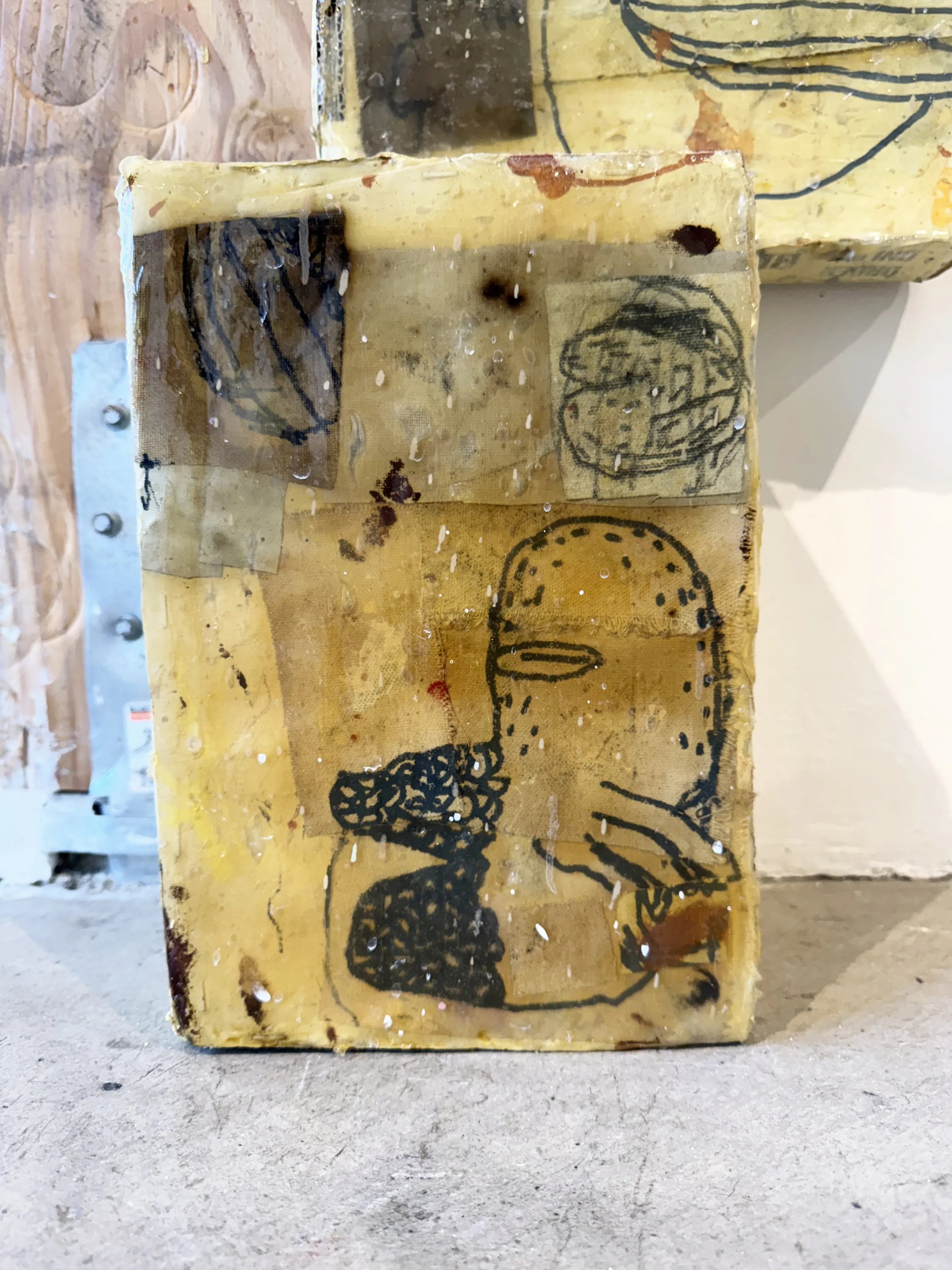 Cesar Herrejon. boxes of inbredation . 2025. Caulk polyurethane, fabric, paper, ink, on found boxes. Dimensions variable.