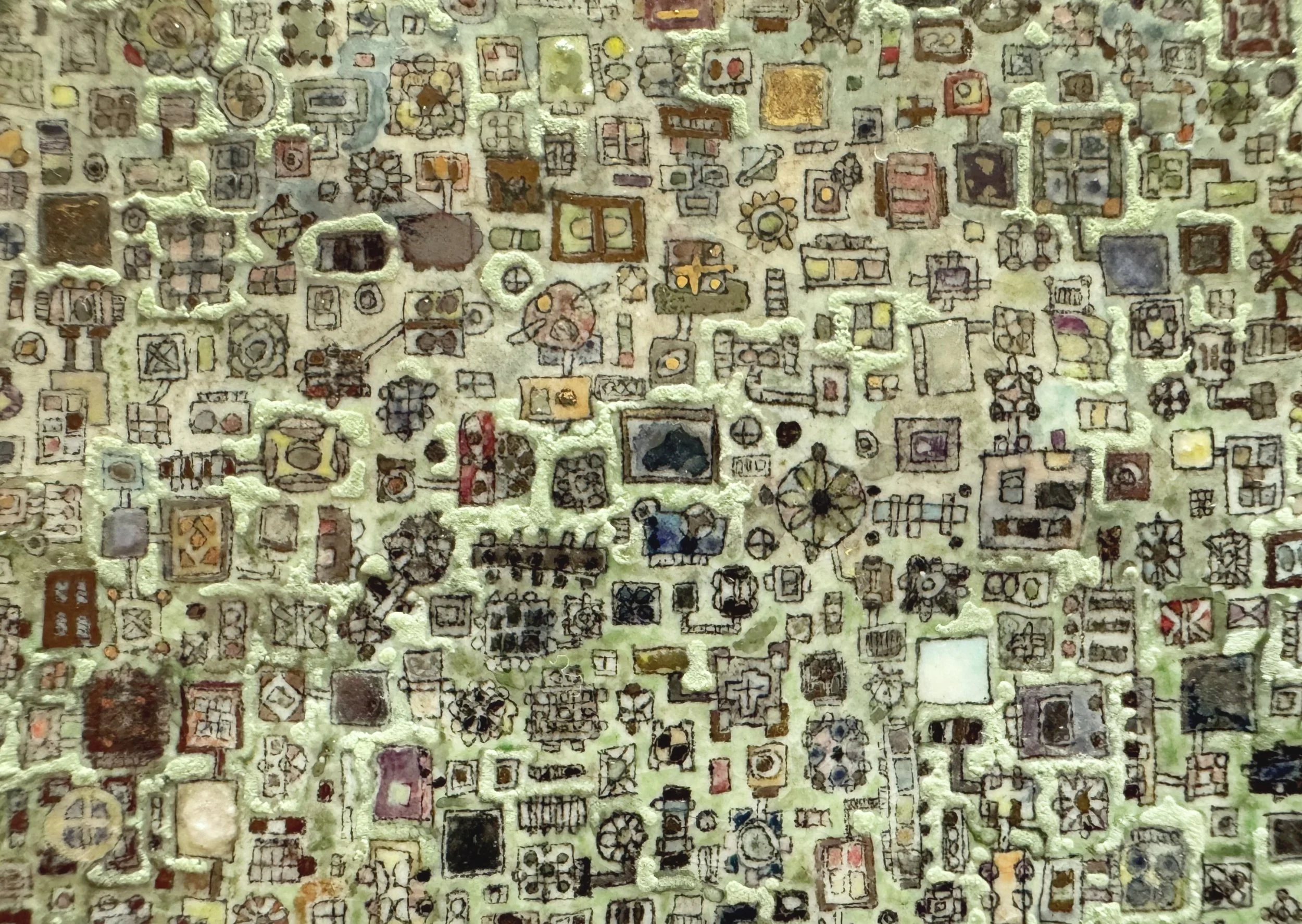 Trey Ross. 023 . 2025. Metal plate etching on porcelain, with glaze, metal oxides, lustres, stains, and frit. 4.5 x 3 inches. [Detail (macro).]