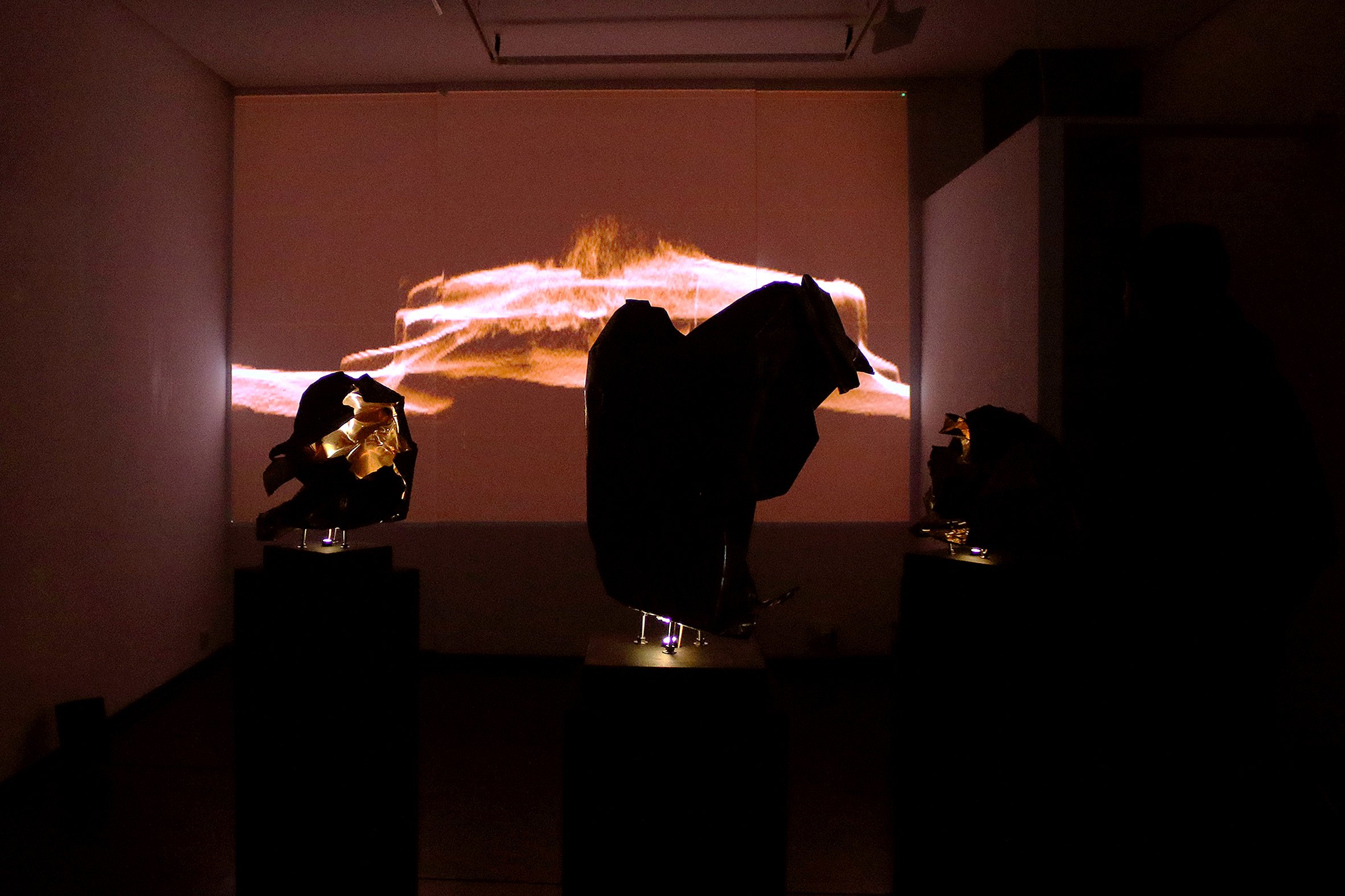This exhibition engages with three novels by Italo Calvino—If On A Winter’s Night A Traveler, Invisible Cities, and Mr. Palomar—as well as the three cities which have paved my own journey to this exhibition: Bangkok, Los Angeles, Rome. The installation interweaves the visual and the aural, the ephemeral and the physical, employing a triptychal, scalable configuration, folding and unfolding each layer, from the cities’ sonic imprints, to the performative, relationally-modular video installation to the three copper sound sculptures. The sounds themselves are created from the performative gestures of social contributors from all three cities, as well as flautist Cari Ann Souter and myself. These are further modulated by the subjective system of the public spect-actor’s movements in the gallery—resisting, yet subsumed within, the fixed system of the video projection’s embedding of mythos. Like the formative and performative actions that make a city, always an entwining of three elements—nature/environs, human/systemic action, and myth/ideology—within time, the work weaves the macro into the micro level. Bordering on either side of abstraction which twist and entwine within each other, from the subjective to the objective back to the subjective and outwards again, these actions do not end with me as the artist but both come from beyond and continue further, from and through systems that form not only the morphology of who we are but that of the cities we live in: embodiments of the disembodied, “spider- webs of intricate relationships seeking a form.” (Invisible Cities)