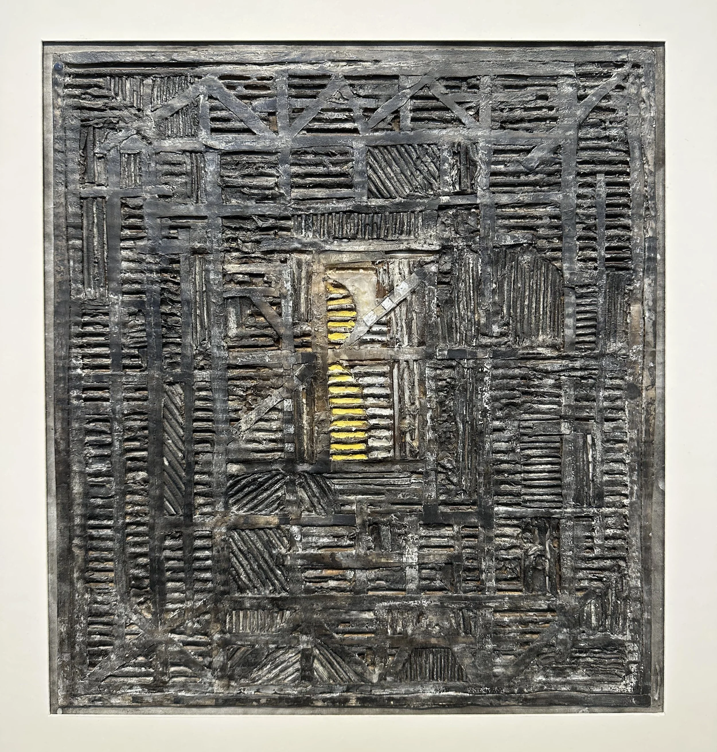 In both Ovsepyan’s early figurative work and his later abstract work, the concurrent aesthetic influence of various movements of modern and contemporary art, as well as medieval Armenian manuscripts, is present across series. These medieval manuscripts are inscribed with highly decorative Armenian script and sophisticatedly organized, puzzle-like structures/geometries formed through colorfully patterned borders. Similarly, his work is also evidently influenced by the colorful and ornately arranged imagery of traditional Armenian rugs. (Though, he often revisions such imagery with a monochromatic palette, as in the two included untitled works from 2009 and 2011.) Initially and ultimately, however, Ovsepyan appears to be most energetically influenced by his own prolific and unrepentant mode of production. Effortlessly, but industriously, his work springs—wakes—from his work (in the wake of his work…). His work continually cycles. He is constantly moving from one series to the next, always exhausting a particular way of working until it comes to be folded into the next phase. And although each series or body of work has its own peculiarities, it is clear that, sequentially, the central matter of his work is simply the passage of time (and space) consumed by making them. This sense of preserving lost time comes clearly into view in his “mummified” works, eternally resting between here and hereafter (as with the included “mumie” (German for “mummy”) piece from 2010). These “mummified” pieces also recall the ancient historical connections between Egypt and Armenia. Mapping borders between worlds upon the bodies of his work, his art forms a record of a life of displacement. Consuming the refuse of his immigrations—cardboard, newspaper, found objects—his work builds the home he was never permitted to have (using all he has left). (Ovsepyan is a former member of the Fine Art Association of the USSR, having been banned for his refusal to paint in the propagandistic style of “social realism.”)